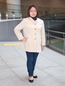 | テーラードカラーのパタンを利用して、ヘチマ衿のロングジャケットを作りました。 上前の箱ポケットを2段にして、アクセントを付けました。生地はウール100%、ストライプのパンツとバランスがよく、着廻しのきく1着になりました。 |