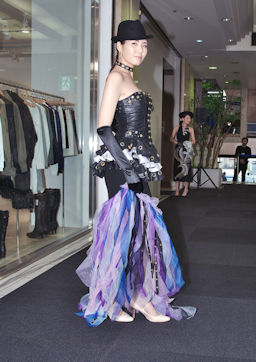 | フェイク・レザーとスタッズを用い、ハードロックなトップに対し、ボトムには、フリル、シフォン、レース、リボンなど、フェミニンな素材を使いました。 円形に立体裁断した、フリルの美しい曲線と、ハードロックなトップの組み合わせで、2つの心を持つ揺れる女性の妖艶さを表現して見ました。 |